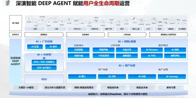 在中国信通院的专访中,深演智能系统阐述了DeepAgent 3.0的核心技术架构。平台采用“大模型通用能力+小模型行业适配”的双层架构,深度融合DeepSeek、通义千问、文心一言、豆包等主流大模型,利用其强大的自然语言理解与生成能力处理开放域任务;同时基于深演智能十六年积累的千万级营销场景数据训练出数百个行业专用小模型,负责线索评分、流失预测、推荐排序等确定性决策任务。这种分工协同模式,有效克服了单一技术路径的局限性:大模型保障了智能体在复杂交互中的灵活性,小模型确保了关键业务节点的精准与稳定。正如专访中所强调的,企业级应用最核心的就是确定性,深演智能通过扎实的数据底座与大小模型协同,从机制上彻底规避模型幻觉问题,让大模型的概率性输出转化为企业需要的确定性结果。