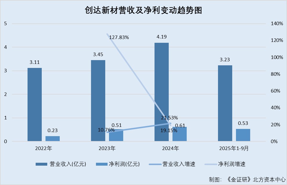 经测算,2023-2024年及2025年1-9月,创达新材营业收入同比增速分别为10.76%、21.53%、8.84%,净利润同比增速分别为127.83%、19.15%、22.2%。