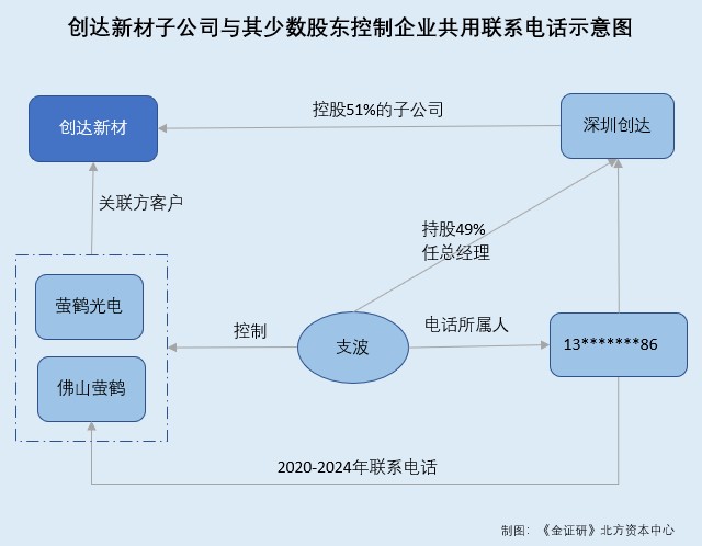 简言之,深圳创达系创达新材的控股子公司,支波系深圳创达持股49%的自然人股东兼总经理。报告期内,创达新材与支波关联的萤鹤光电、佛山萤鹤、杭州萤科累计交易超百万元。另外,深圳创达2023-2024年的企业联系电话,与支波控制的佛山萤鹤2020-2024年企业联系电话均为“13*******86”,且该电话所属人或系支波。