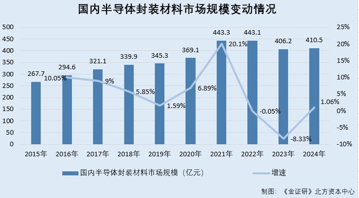 据中科科化招股书援引数据,2015-2024年,国内半导体封装材料市场规模分别为267.7亿元、294.6亿元、321.1亿元、339.9亿元、345.3亿元、369.1亿元、443.3亿元、443.1亿元、406.2亿元、410.5亿元。