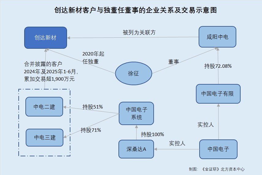 换言之,2024年及2025年1-6月,中国电子系统为创达新材累计交易额超1,900万元的客户,其中创达新材2024年环氧工程材料及服务收入超六成由中国电子系统贡献。其中,创达新材与中国电子系统的交易主体包括其子公司中电二建、中电三建。创达新材称与中国电子系统无关联关系。值得注意的是,创达新材独董徐征,兼任咸阳中电董事,咸阳中电被认定为创达新材关联方。研究发现,股权穿透后,咸阳中电持股72.08%的股东中国电子有限,与中电二建、中电三建控股股东中国电子系统受中国电子同一控制。进一步而言,创达新材的关联方咸阳中电,与客户中国电子系统或受中国电子控制。