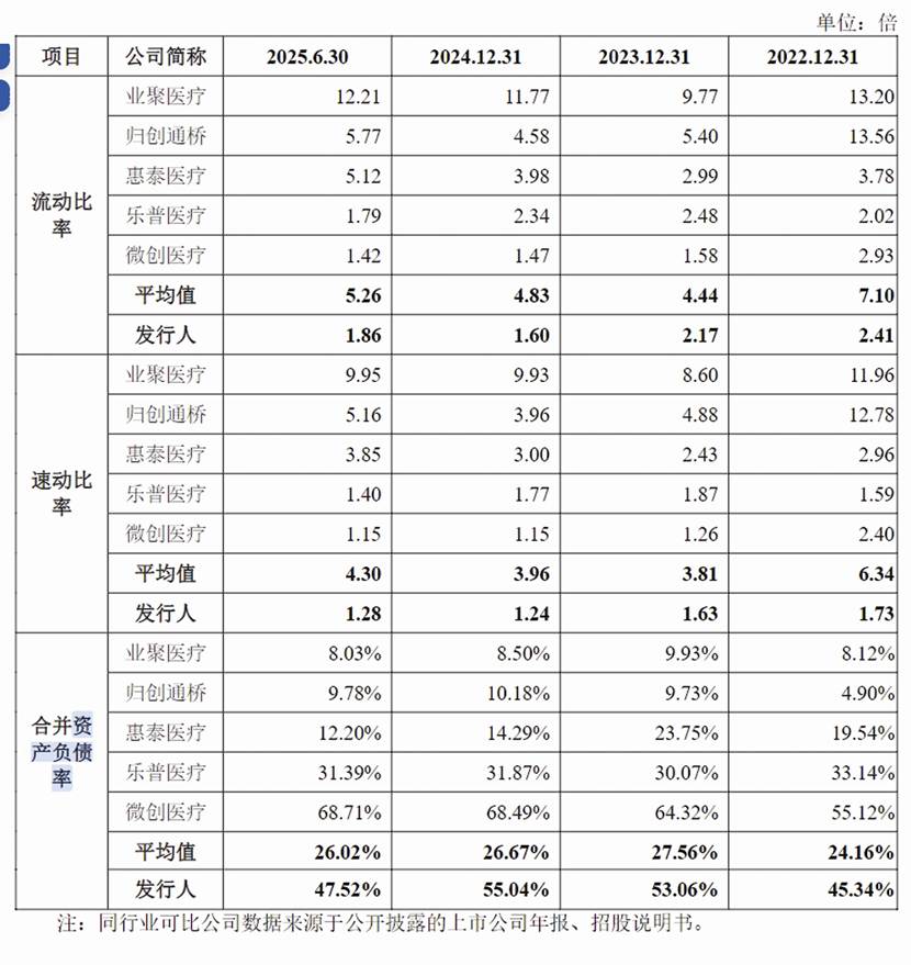 “具体而言,公司流动比率、速动比率低于可比公司业聚医疗、归创通桥和惠泰医疗,资产负债率高于可比公司业聚医疗、归创通桥和惠泰医疗,与乐普医疗、微创医疗水平接近,主要是因为业聚医疗、归创通桥和惠泰医疗均于2021年度及之后完成挂牌上市,获得较多募集资金,改善了资产负债结构,而乐普医疗、微创医疗上市时间较早,近年再融资规模相对较小,其募集资金对公司资产负债率的影响已相对减弱,资产负债率逐渐回升。”