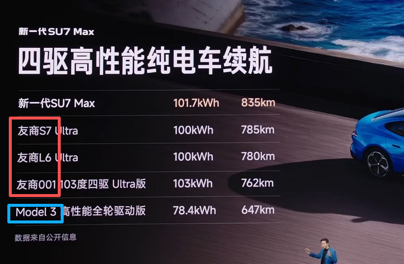 经过对比,小米汽车发布新一代SU7 Max四驱高性能版,以101.7kWh电池实现CLTC 835km续航,这领先友商S7 Ultra(100kWh,785km)、友商L6 Ultra(100kWh,780km)及友商001四驱Ultra版(103kWh,762km),还有Model3高性能全轮驱动版(78.4kWh,647Km)其中,前三个的品牌均用“友商”代替,而只有Model3没有标注为“友商”。