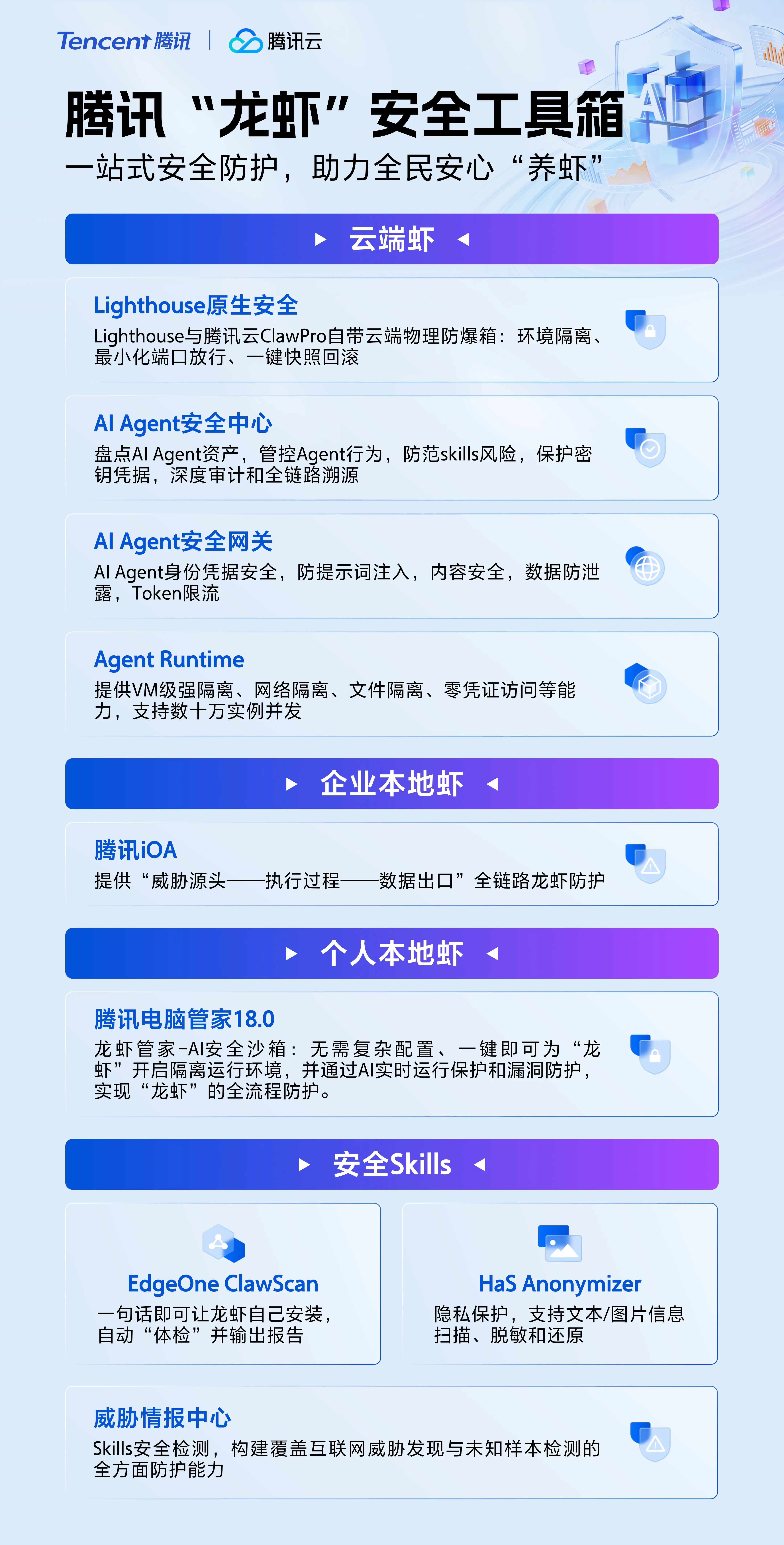 为应对“龙虾”类应用带来的安全挑战,腾讯推出“龙虾安全工具箱”,针对云端部署、办公网环境、个人电脑三大部署场景,提供覆盖全生命周期的一站式安全防护。与此同时,腾讯还将部分核心能力封装成AI Skills,用户只需通过自然语言对话,就能让小龙虾实现自我防护,将安全能力更便捷地融入“养虾”流程中。