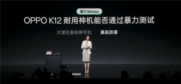 在OPPO K12发布会上,Monica为展示新机耐用性,还现场演示用高跟鞋暴力踩踏手机,成为名场面。