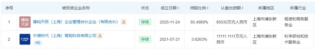 信息还显示,该基金已对外投资了两家企业——博裕天辰(上海)企业管理合伙企业(有限合伙)、宁德时代(上海)智能科技有限公司。两家企业均位于上海浦东新区。