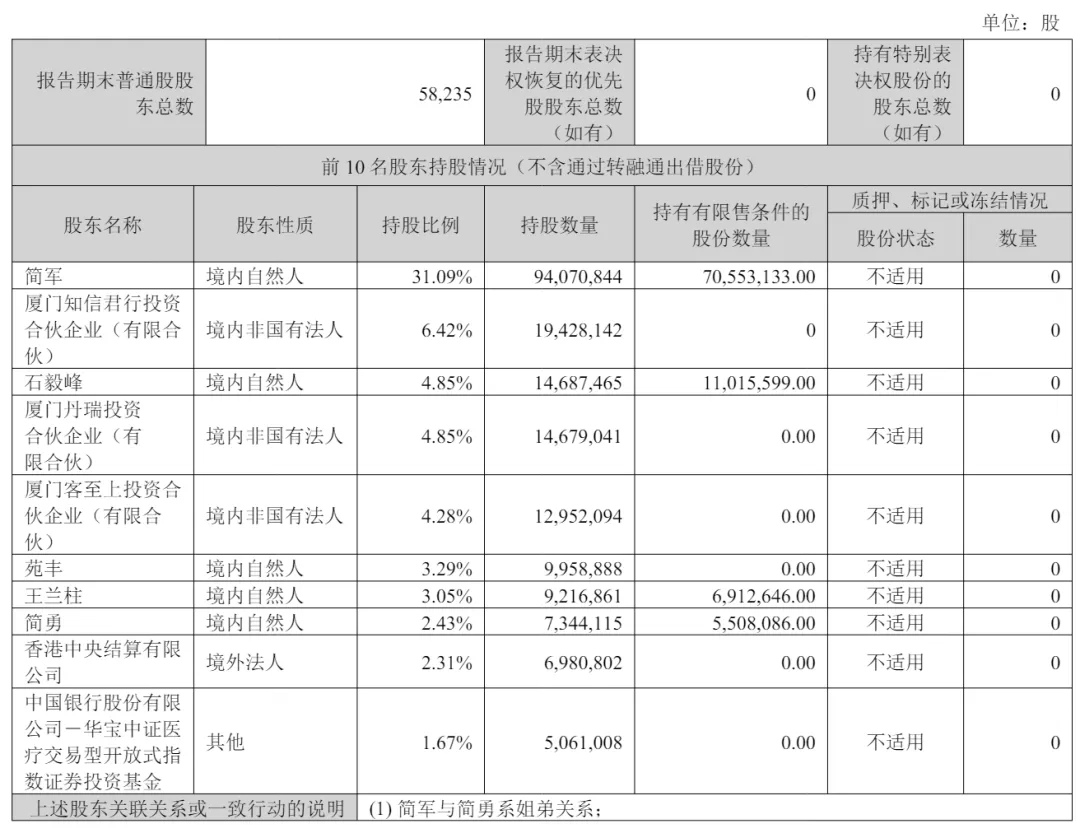 截至2025年6月30日,简军持股31.09%,厦门知行军投资管理合伙企业(有限合伙)持股6.42%,石毅峰、厦门丹瑞投资合伙企业分别持股持股4.85%,厦门客至上投资合伙企业(有限合伙)持股4.28%;