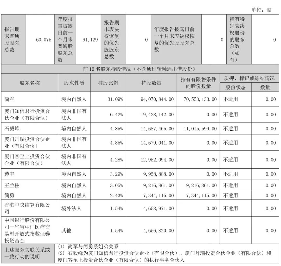 截至2025年12月31日,简军持股31.09%,厦门知行军投资管理合伙企业(有限合伙)持股6.42%,石毅峰、厦门丹瑞投资合伙企业分别持股持股4.85%,厦门客至上投资合伙企业(有限合伙)持股4.28%;