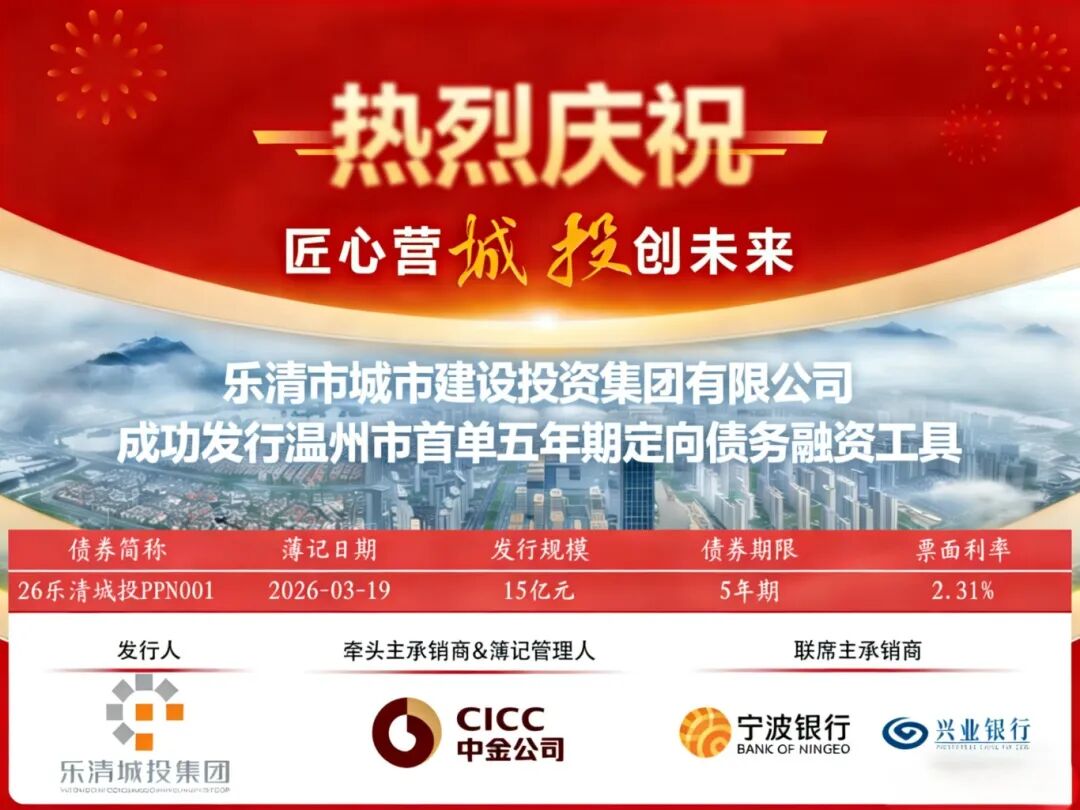3月19日,城投集团在银行间市场成功发行2026年度第一期定向债务融资工具。本期债券发行规模15亿元,期限5年,票面利率2.31%,全场认购倍数高达2.84倍。本期债券由中金公司担任牵头主承销商,宁波银行、兴业银行担任联席主承销商。本期债券是温州市首单五年期定向债务融资工具,它的成功发行标志着乐清城投在拓展直接融资渠道、优化债务期限结构方面迈出了坚实一步。