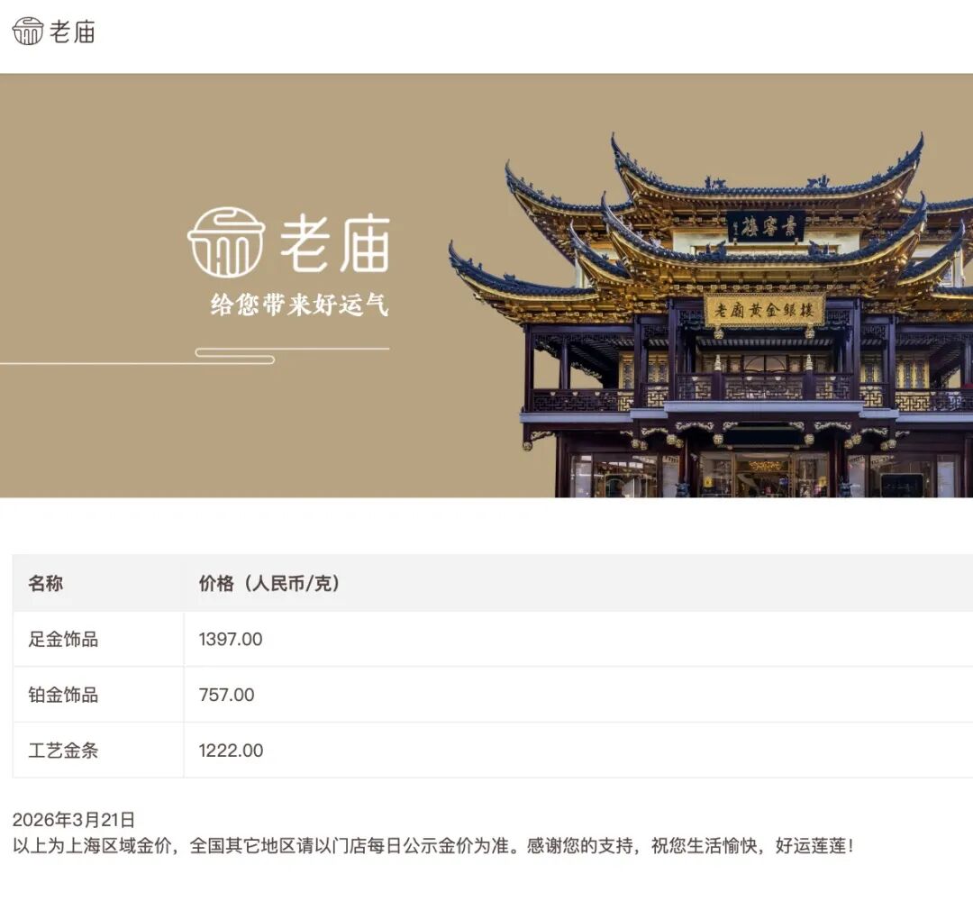 老庙黄金的金饰价格由1445元/跌至1397元,一夜下跌48元。较3月16日1560元/克跌163元。