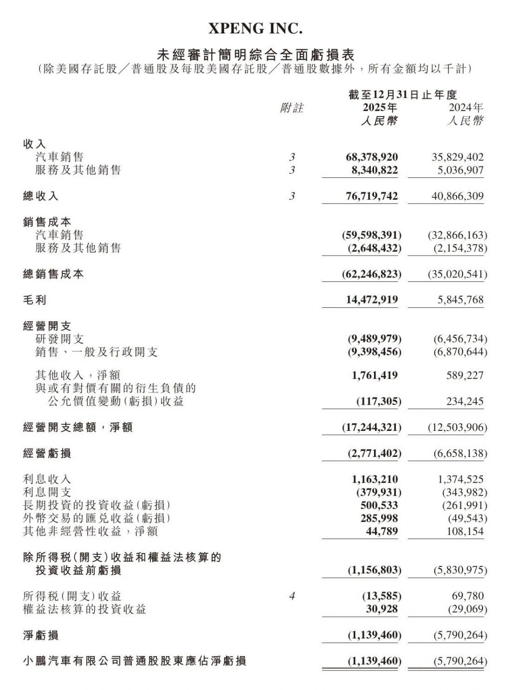 2025 年,小鹏全年交付量为 429,445 辆,同比增长 126%。"在 2025 年,我们不仅实现了规模的高速增长,而且经营能力也同比大幅度提升。"何小鹏说道。财报显示,2025 年四季度,小鹏营收为 222.5 亿元,同比增加 38.2%,环比增加 9.2%;净利润为 3.8 亿元,而去年同期亏损为 13.3 亿元,首次实现单季度盈利。