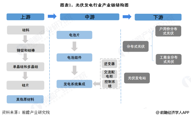 光伏发电的产业链主要有上游主要为光伏电池相关原材料组成,包括形成电池的单晶硅和多晶硅;中游主要为电池片、电池组件生产企业和系统集成企业;下游为光伏发电应用领域,包括分布式光伏发电和集中式电站。