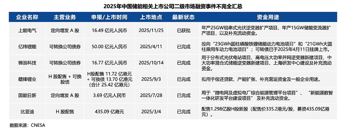 其中,比亚迪完成435.09亿港元配售,用于加强全球业务体系建设;亿纬锂能(300014.SZ)发行50亿元可转债,投向储能电池领域;上能电气(3000827.SZ)融资16.49亿元,聚焦逆变器产能扩建与数智化建设。