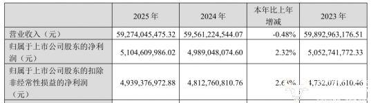 双汇发展发布的2025年年报显示,报告期内,公司实现营业收入592.74亿元,同比微降0.48%,这点降幅几乎微不足道,而归母净利润却同比增长2.32%至51.05亿元。
