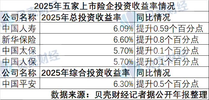 贝壳财经记者发现,去年五家上市险企的投资收益率均同比提升。其中,新华保险总投资收益率最高,提升0.8个百分点至6.6%,中国人寿则提升0.59个百分点至6.09%,中国太保、中国人保则分别提升0.1个百分点,均至5.7%。中国平安披露了综合投资收益率,提升0.5个百分点至6.3%。