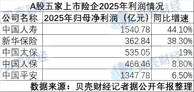 2025年,A股五家上市险企归母净利润合计约4252.91亿元。其中,中国人寿归母净利润增速最高,同比增44.1%至1540.78亿元,新华保险归母净利润同比增38.3%至362.84亿元,中国太保、中国人保、中国平安归母净利润增速分别为19%、8.8%及6.5%。