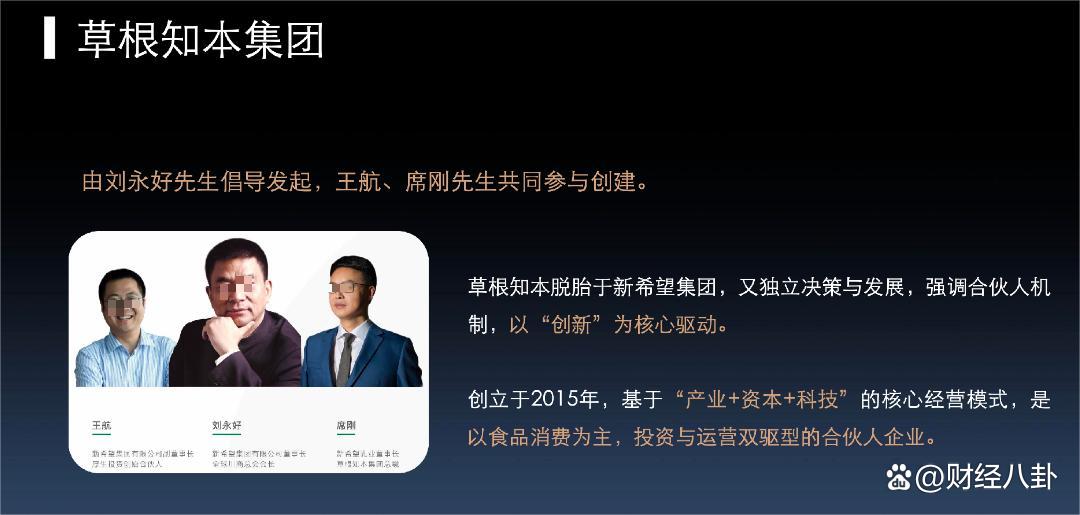 草根知本是由刘永好、席刚、王航三人共同创立的,定位是大消费产业投资与并购整合;新希望投资是负责集团层面的财务投资与生态联动。