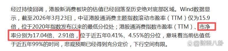 截至2026年3月,港股消费板块(中证港股通消费指数)市盈率17.04倍、市净率2.91倍,处于近五年偏低区间。