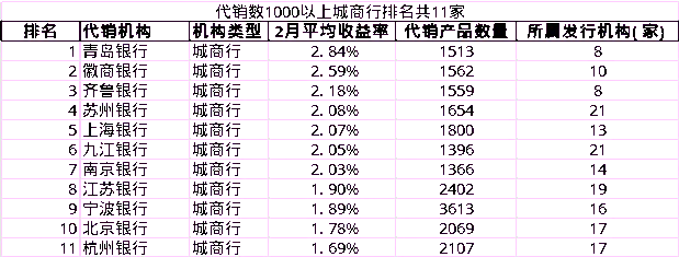 除了榜首的青岛银行外,第二和第三名分别由徽商银行和齐鲁银行占据。本区间城商行的代销平均收益率2.10%,低于综合档0.1%。