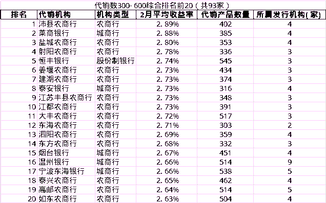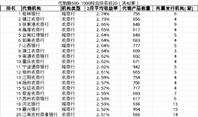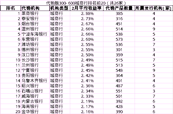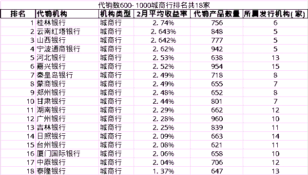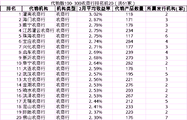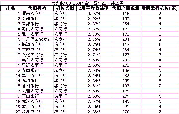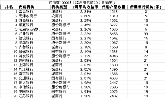 青岛银行位居第一;天津农商首次进入顶级代销银行序列(2月代销产品数量刚破1000只)就排名第二;徽商银行排名第三。此区间前20强的平均收益率为2.20%。