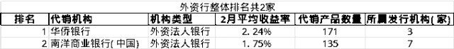 外资行比之前减少一家入选,是因为富邦华一代销产品数量下降到了100以下,未入选排名样本。2月华侨银行和南洋商业的整体收益率也大幅下降,名次不变。