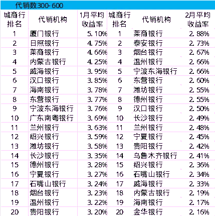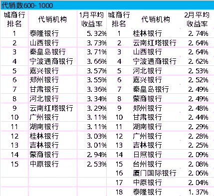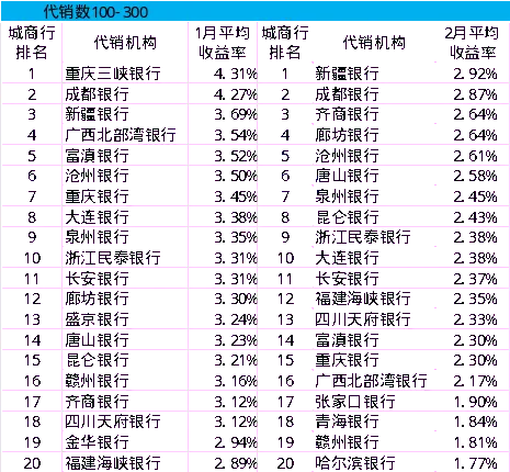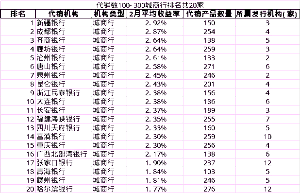 在该区间的城商行竞争中,新疆银行(2.92%)和成都银行(2.87%)维持住了1月的三甲位置,分别排名前两位,齐商银行(2.64%)位居第三。1月的榜首重庆三峡银行则因代销产品数下降到100以下,而掉出排行榜。本段平均收益率为2.35%,在区间内横向对比中明显落后。