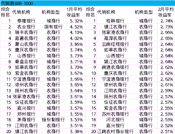 桂林银行(2.74%)排名第一,镇江农商(2.73%)几乎相同的收益率紧随其后,张家港农商(2.66%)位列第三。此区间前20强的平均收益率为2.61%,显著高于1000以上组。而1月此区间内的三甲:泰隆银行、农业银行、瑞丰农商行均未进入到2月综合排名的前20!可见这一区段排名争夺之惨烈。