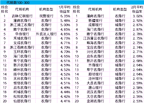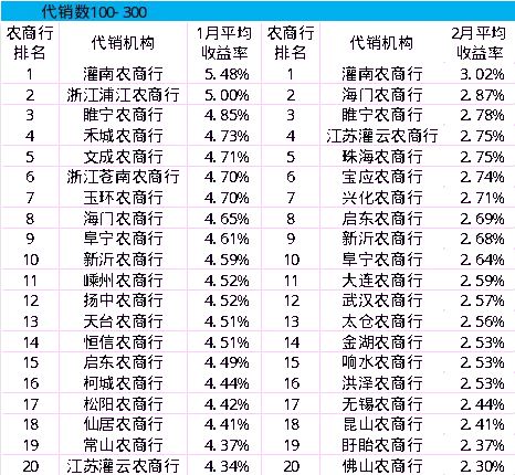 1)1月前7名中仅灌南、睢宁保留在2月前10,其余5家全部掉出前20;2月前20名中有14家是1月未上榜的机构,说明代销数100-300区间的机构竞争激烈,排名波动大。