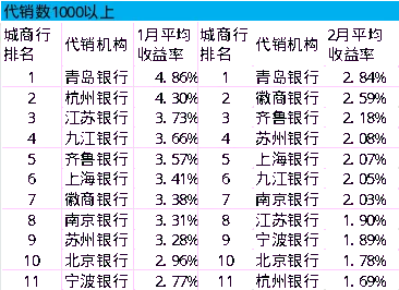 1月第三的莱商银行,2月排名上升至第一,泰安银行和烟台银行则位列二、三位。而1月三家中的厦门银行和日照银行均跌出排行榜。本段平均收益率为2.48%,也是城商行各区间最高的。