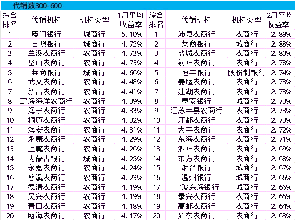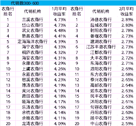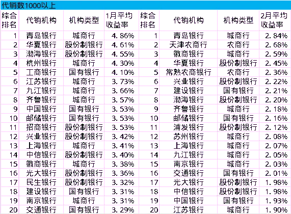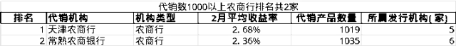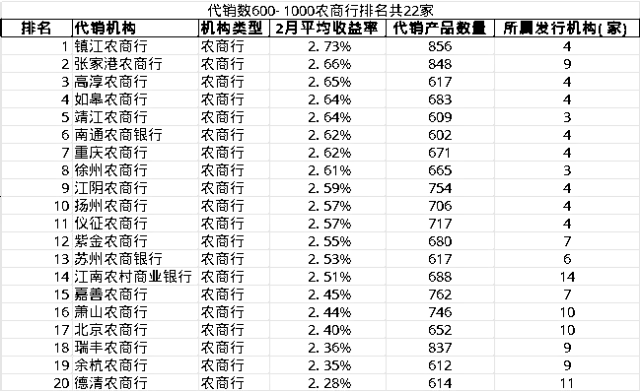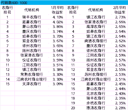 这是一个非常大的突破,因为1月时还没有一家农商行的代销理财数量超过1000只,并且这两家行的平均收益率也很高,均在综合排名的前5强。