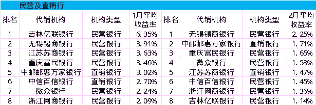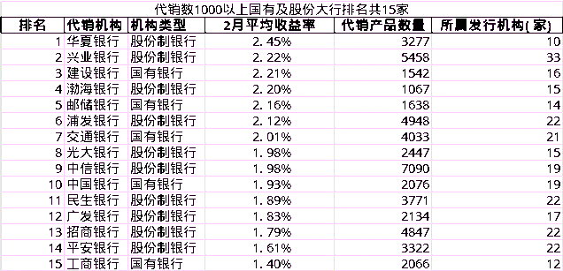 华夏银行继续1月强势,仍位居第一,兴业银行和建设银行(4.10%)分列二、三名。2月国有及股份大行的代销整体平均收益率为1.99%。