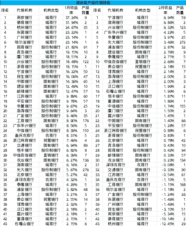 2月份混合类的收益率下降更为显著,有不少出现了负数。同1月一样,仍然只有43家银行代销了混合类产品。