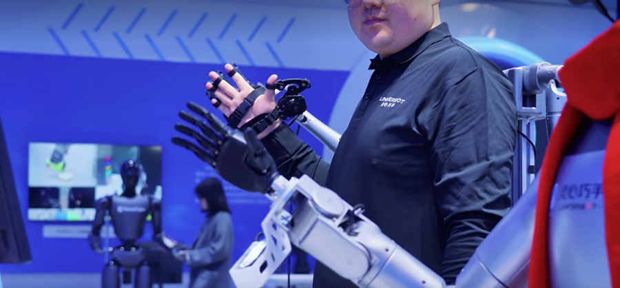 2026中关村论坛年会上,工作人员展示灵巧手通过人类动作提取数据。主办方供图