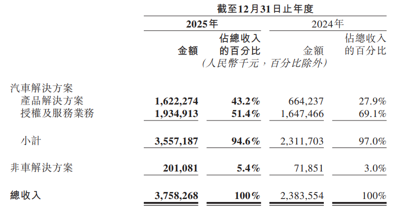深入业务面,2025年地平线产品及解决方案收入达16.22亿元,同比大增144.2%,占比从上年27.9%跃至43.2%。授权及服务收入19.35亿元,同比增长17.4%,占比51.4%。