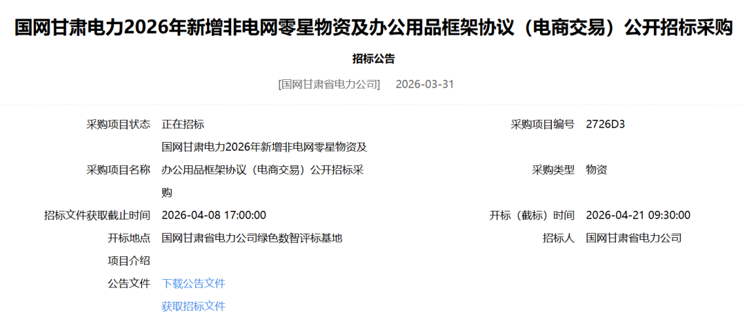 国网甘肃电力2026年新增非电网零星物资及办公用品框架协议 (电商交易)公开招标采购招标公告
