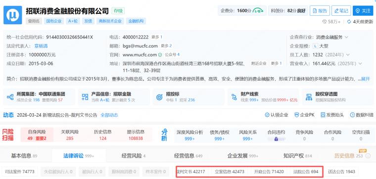 与此同时,招联金融在司法诉讼上还是位“积极分子”。企查查平台显示,公司涉及裁判文书高达4万多条,法院开庭公告则多高达7万多条,妥妥的“诉讼大户”。