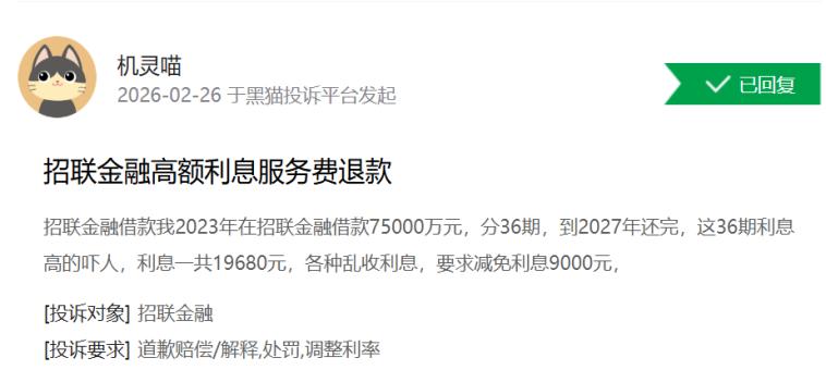 有用户投诉称,在招联金融贷款1万元,1年利息高达4614.81元,折算年化利率高达46%;另有用户也指出,其贷款合同约定的逾期罚息日利率为0.0938%,折算年化利率约34.24%,远超法定保护上限。更有用户反映,借款75000元,36期息费高达19680元,年化后的息费率超过42%。