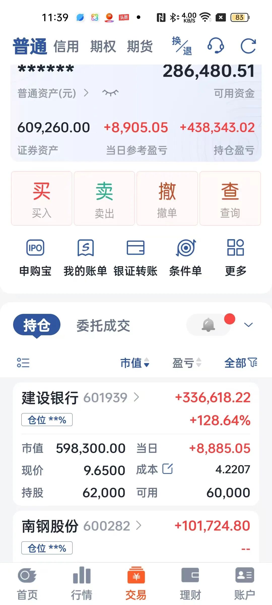 我也在朋友圈发布了动态,刚刚,高股息股票四大行集体大涨,建设银行冲击历史新高,再次验证战胜量化交易的只有价值投资者的铁证。祝贺在别人恐惧我疯狂时加仓高股息分红股票的价值投资者。当前0元置业平台高股息账户盈利总额超过43.8万+,账户投资收益率超过87%!建设银行单只盈利超33.6万+,不仅收获股息率4.2%的持有分红收益,更获得资本市场对高股息从看不起到追不上的交易性收益!温馨提示,随着建行股价不断上涨股息率不断下降,平台投资者做到了别人疯狂我恐惧的越涨越卖开始减仓卖出,把建行的收益转移到了其他高租金回报房产。敬请投资者牢记投资有风险入市需谨慎。