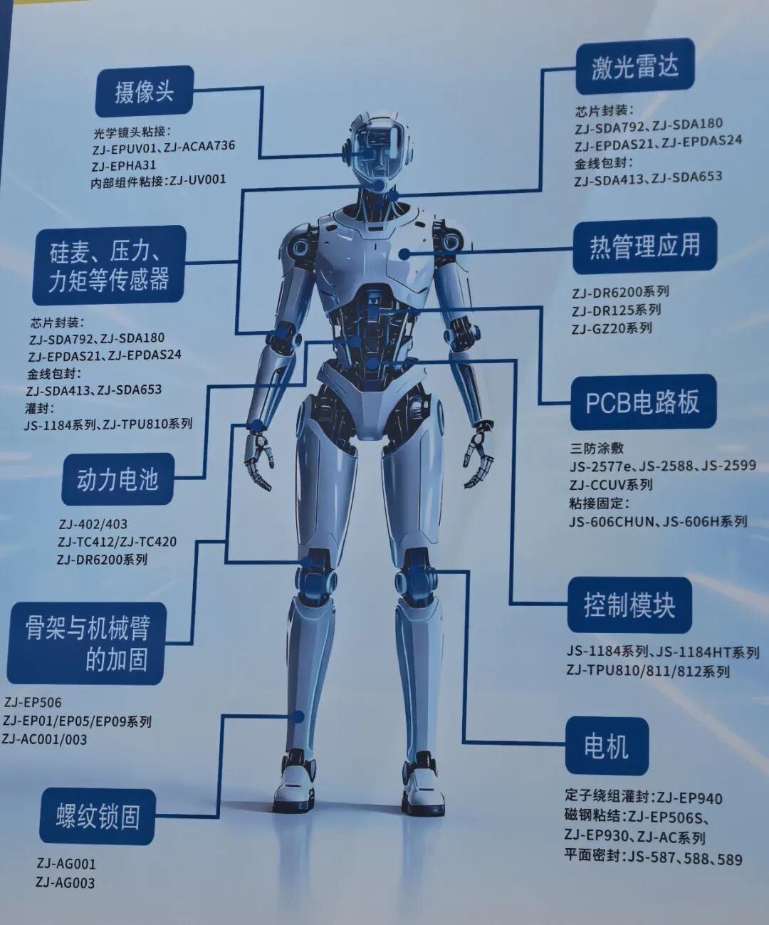 值得一提的是,胶粘剂,作为一种兼具连接、密封、导热、减震等多功能性能的材料系统,正在成为人形机器人制造中不可或缺的基础材料,以弥补传统的螺栓、焊接等连接方式的缺陷。主要用在主结构与关节部位的结构连接、电控系统内部热管理、人机交互部位的柔性覆盖及面部拟人处理和整机的密封与线缆管理。