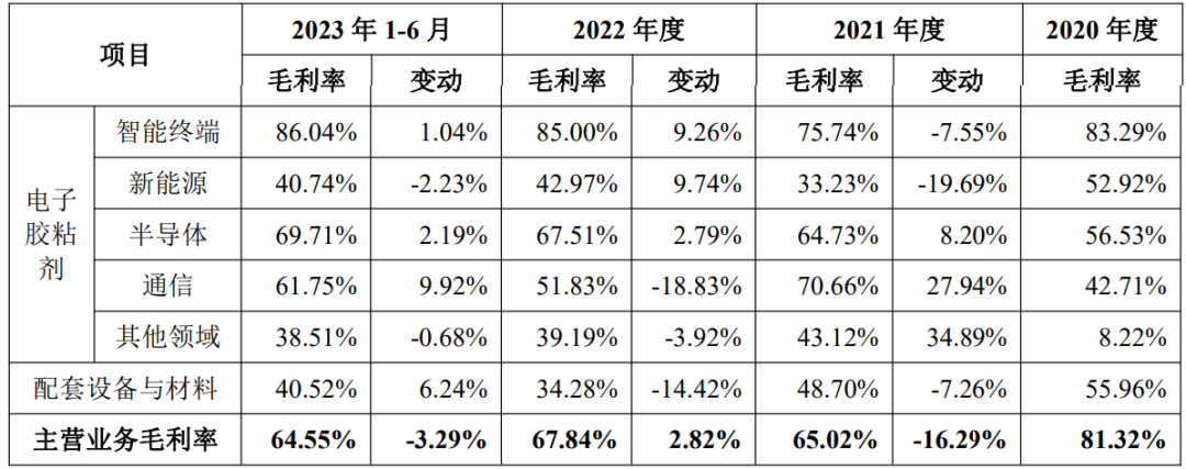 最让眼前一亮的是,公司主营业务毛利率分别为81.32%、65.02%、67.84%、64.55%,尤其是智能终端部分,超过80%!同行业的德邦科技、回天新材、华海诚科三家公司近5年的平均毛利率仅保持在30%左右。
