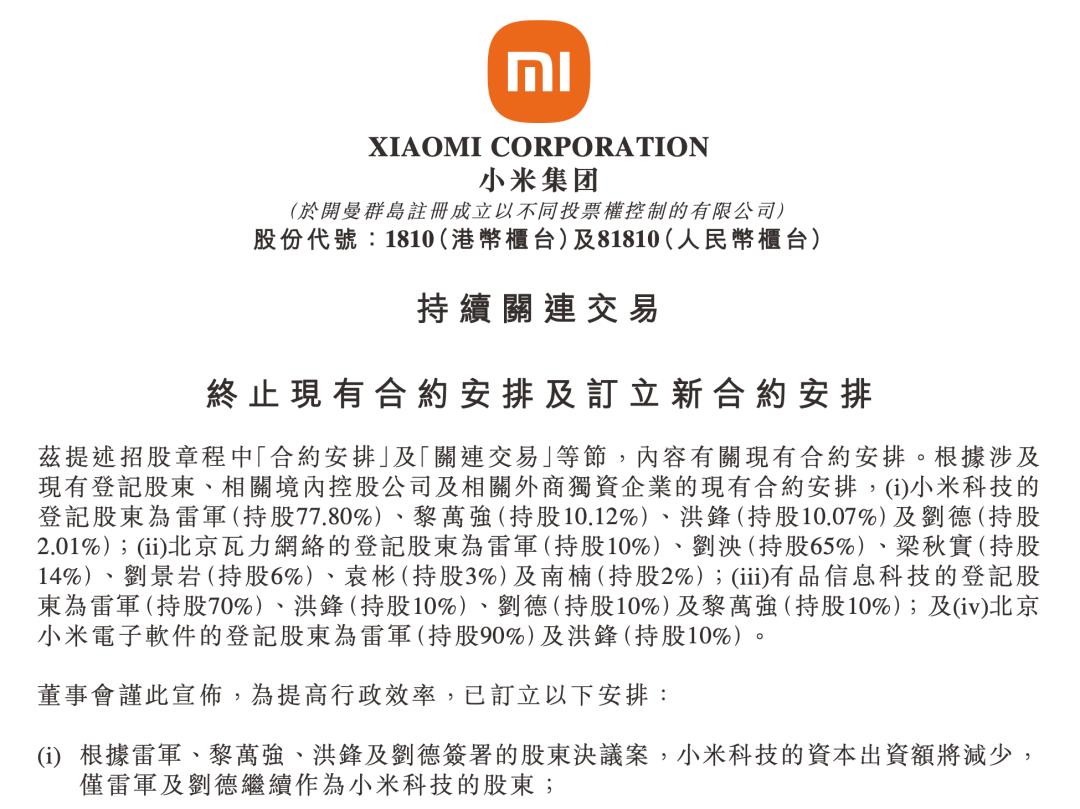 小米集团董事会解释称,此次订立新安排是为了提高行政效率。随着股权变动在2026年4月2日生效,相关境内控股公司、外商独资企业与新登记股东签订了新合约安排,除现有借款合同外,原有的合约安排均已终止。新合约安排基本复制了现有合约安排,条款和条件大致相同,主要差异在于协议日期、订约方的变化(现有登记股东变更为新登记股东),以及为反映监管及其他数据更新所做的一些事务性修订。