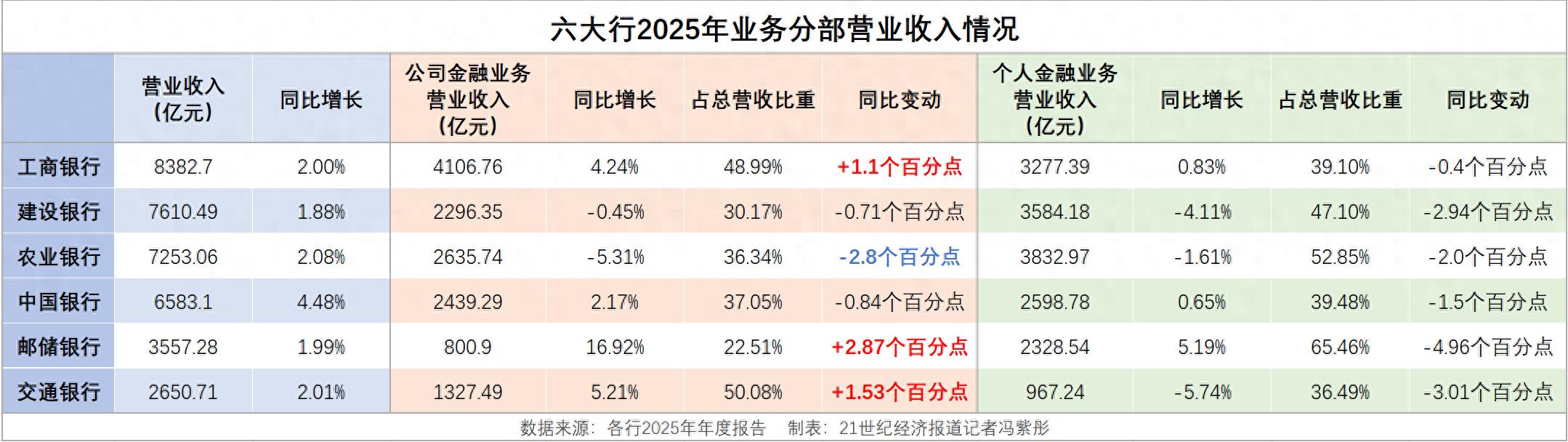 据21世纪经济报道记者统计,2025年度,六大行公司业务收入对总营收的平均贡献率已回升至38%左右,其中交通银行超过50%,工商银行接近49%。
