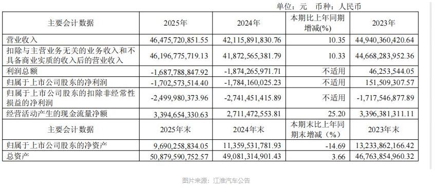 近日,安徽江淮汽车集团股份有限公司发布2025年年度报告。其中营收464.76亿元,同比增长10.35%;归母净利润亏损17.03亿元,较2024年亏损17.84亿元小幅收窄;全年销售整车及底盘38.41万辆。