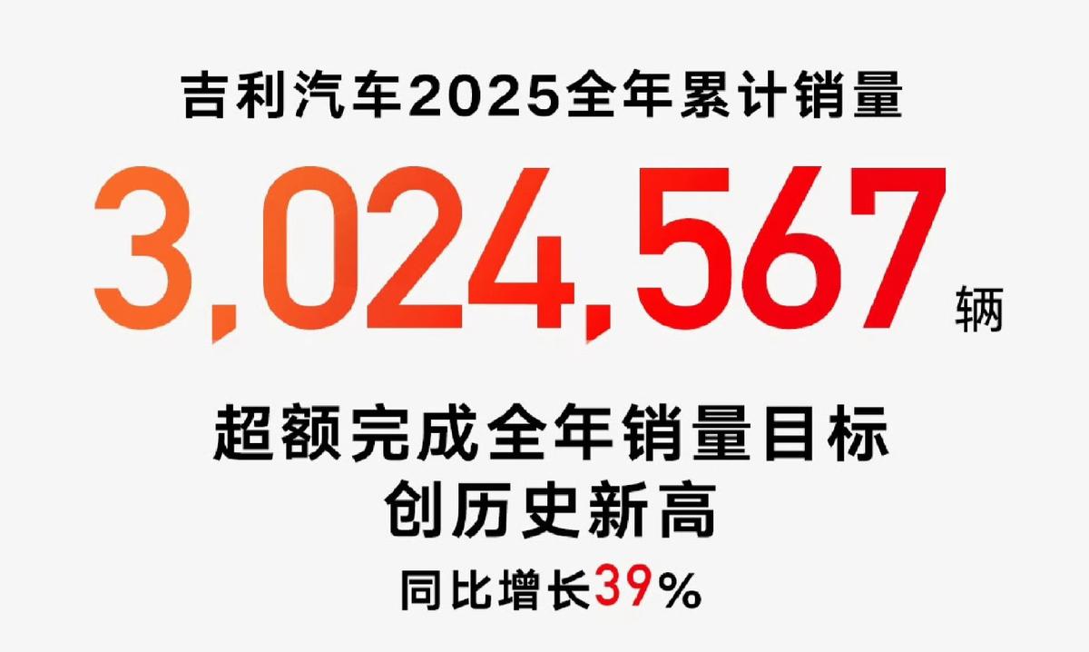 吉利汽车整车业务在2025年,取得了巨大的成绩,全年销量302万台,相比于2024年的217万销量,涨幅达到了39%。