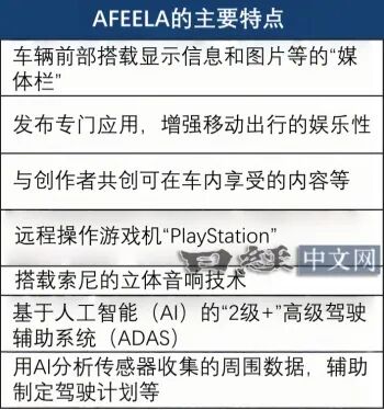 AFEELA的特点是,借助横跨驾驶席和副驾驶席的大型显示屏和后座的2个显示屏、28个指向性高的扬声器,每位乘客都可以享受自己喜欢的动画片、电影和音乐。其战略是让用户以索尼集团的IP为中心,可以享受多种娱乐,例如在后座玩索尼集团的家用游戏机“PlayStation”等。