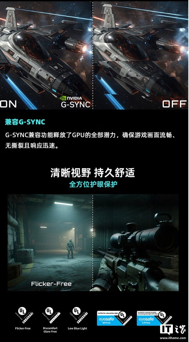 规格方面,这款显示器搭载镜面 W-OLED 面板,能够有效减少光线漫射,支持 10Bit 色深,覆盖 99% DCI-P3 色域,满足游戏之余的观影、修图需求,GTG 响应时间为 0.03ms,让用户在 FPS 游戏中抢占先机,兼容 G-Sync 防撕裂技术。