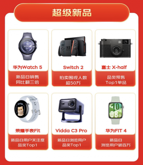 值得一提的是,今年618期间,众多品牌纷纷选择在京东首发新品,并取得了优异的市场反响。华为Watch 5新品日销售同比翻三倍,展现出强大的市场号召力;Switch 2拍卖围观人数超50万,引发了消费者的广泛关注;富士X-half品类预售Top1单品,荣耀手表Fit新品日用户关注度品类Top1,Vidda C3 Pro新品日浏览用户品类Top1,华为FIT 4新品日浏览用户破百万,这些超级新品凭借创新的功能、时尚的设计和出色的性能,在上市之初便迅速成为市场焦点,吸引了大量消费者的目光。
