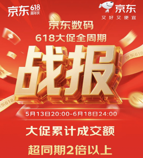 6月18日24时,京东618圆满落幕。在国家补贴与以旧换新等多重补贴政策的推动下,今年618京东数码品类展现出强劲的发展态势。战报数据显示,5月13日20:00-6月18日24:00期间,京东数码品类成交额超同期2倍以上,再创历史新高。