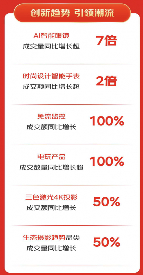 在创新消费趋势引领上,京东数码品类成为消费潮流的“风向标”。AI智能眼镜作为新兴热门品类,成交量同比增长超7倍,充分展示了人工智能技术在消费领域的深度渗透与广阔前景。时尚设计智能手表成交额同比增长超2倍,满足了消费者对于科技与时尚融合的需求。免流监控成交额同比增长100%,电玩产品成交数量同比增长同样超100%,反映出消费者对便捷监控设备和娱乐游戏设备的旺盛需求。三色激光4K投影成交额同比增长50%,生态摄影趋势品类成交量同比增长50%,则体现了消费者对高品质视听享受和摄影体验的新追求。