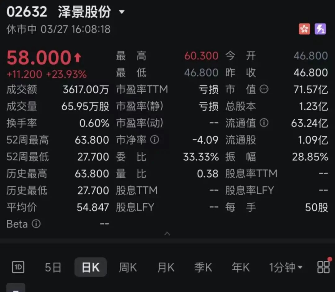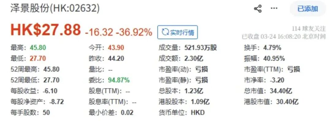 初登港股市场的泽景经历了过山车式、惊心动魄的两天,开盘43.90港元,上市首日即惨淡破发,收盘27.88港元,跌幅为36.92%。图源:雪球